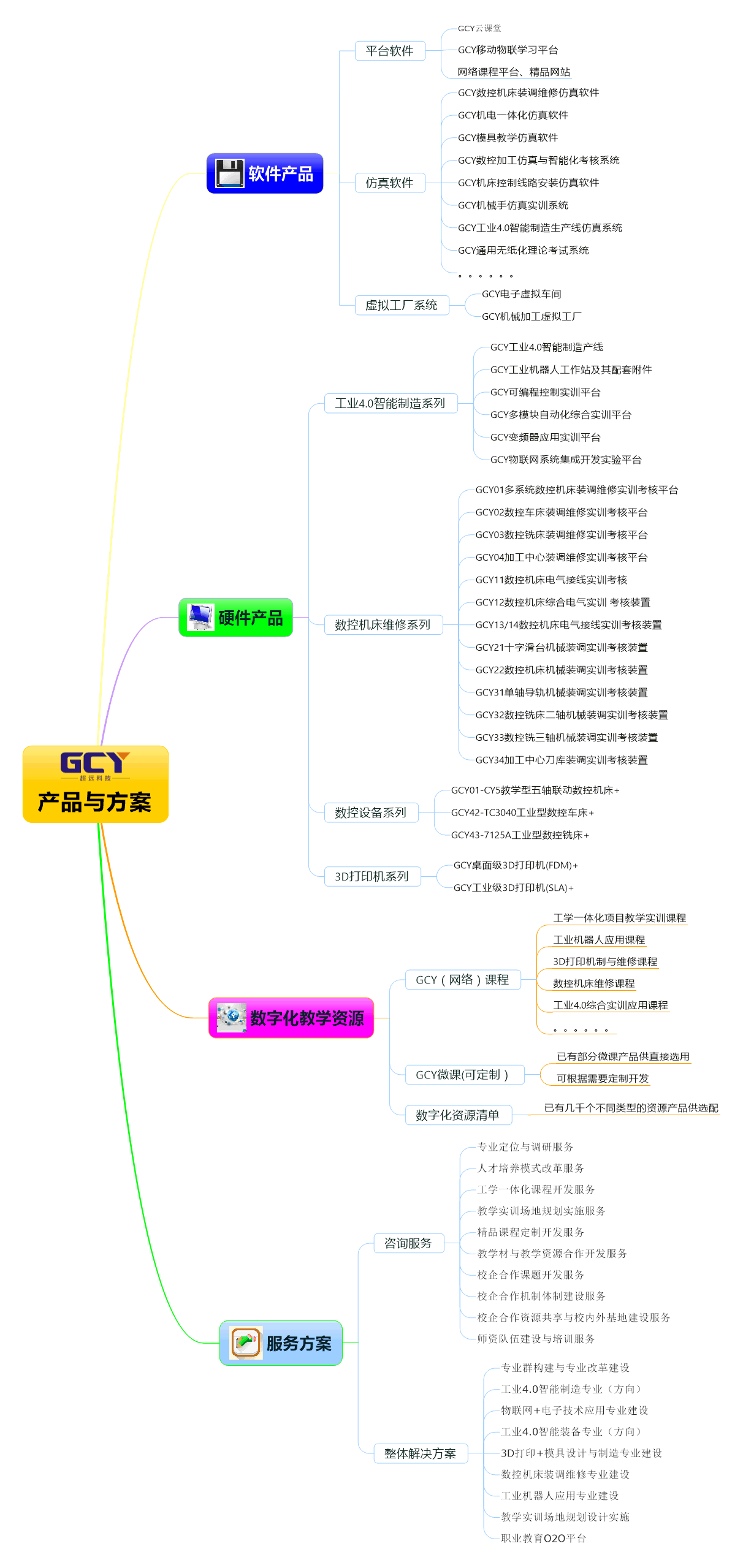 GCY company mainly provides technical services for assembly、maintenance and transformation of CNC machine tool;provides transformation services of intelligent manufacturing (production line mechanical design,electrical control design,MES control system,intelligent manufacturing control system, Semi physical simulation euipment of intelligent manufacturing);its education department provides vocational colleges with overall teaching solutions of intelligent manufacturing and CNC equipment maintenance( personnel training program、teaching and training equipment、production practice equipment, planning of training site,teacher’s professional and technical training,teacher’s curriculum development training, school-enterprise cooperation, international exchanges) ;Provide equipment and techincaol support services for National Vocational Students Skills Competition of CNC machine tool assembly & maintenance & transformation, of intelligent manufacturing application technology。