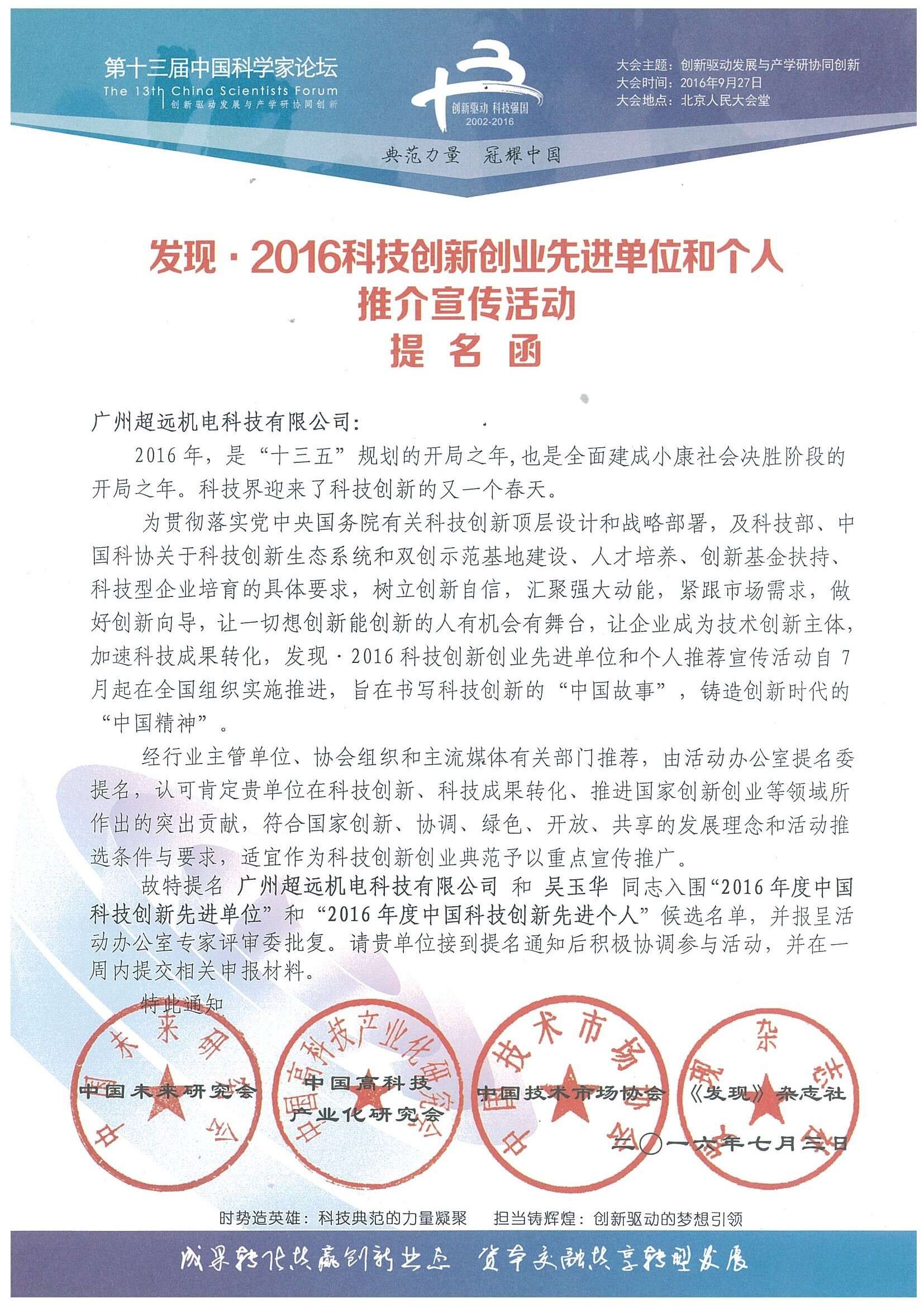 超遠科技入圍“2016中國科技創(chuàng)新先進單位”候選總名單