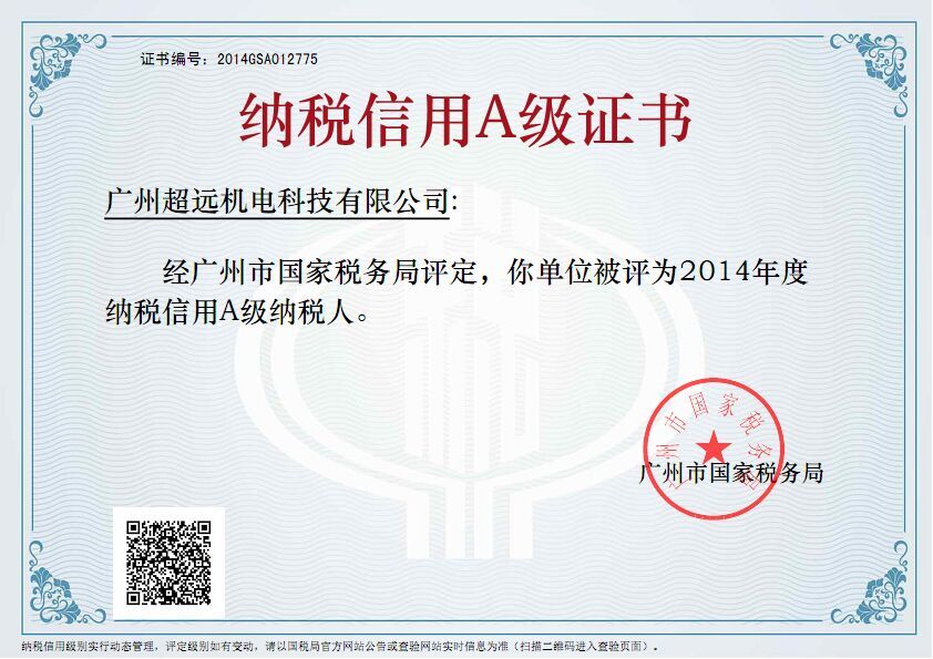 廣州超遠機電科技有限公司憑借誠信納稅的良好信譽,被廣州市國家稅務局評定為廣州市2014年度納稅信用A級法人。