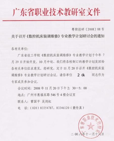 2008年11月27日,我司應勞動和社會保障部職業技能鑒定中心和廣東省職業技能鑒定指導中心的邀請,召開的數控機床裝調維修工等職業的國家題庫審定會,主要參與數控機床裝調維修工國家題庫的編寫和審定工作。