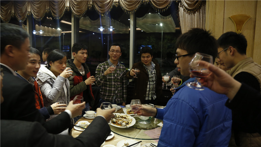 晚宴上,大家邊吃邊聊邊發(fā)紅包,笑聲一波又一波地響起,酒杯一次又一次地碰起,“來干”、“不醉不歸”成了晚宴上使用頻率最高的詞。自己過去一年在超遠(yuǎn)經(jīng)歷的點(diǎn)點(diǎn)滴滴、和同事之間的情、對(duì)彼此想說的話、道不盡的感謝全融在這酒杯里了。