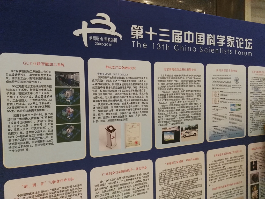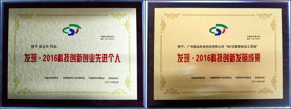 通過層層選拔評比,我司“GCY互聯智能加工系統”,順利通過了第十三屆科學家論壇組委會組織的科學家院士初審和終審,榮獲了2016科技創新發明成果獎!該項成果,是本次評選成果項當中,在工業4.0智能制造領域唯一獲獎的項目,同時,公司董事長吳玉華榮獲2016科技創新創業先進個人獎,并應邀出席了會議。
