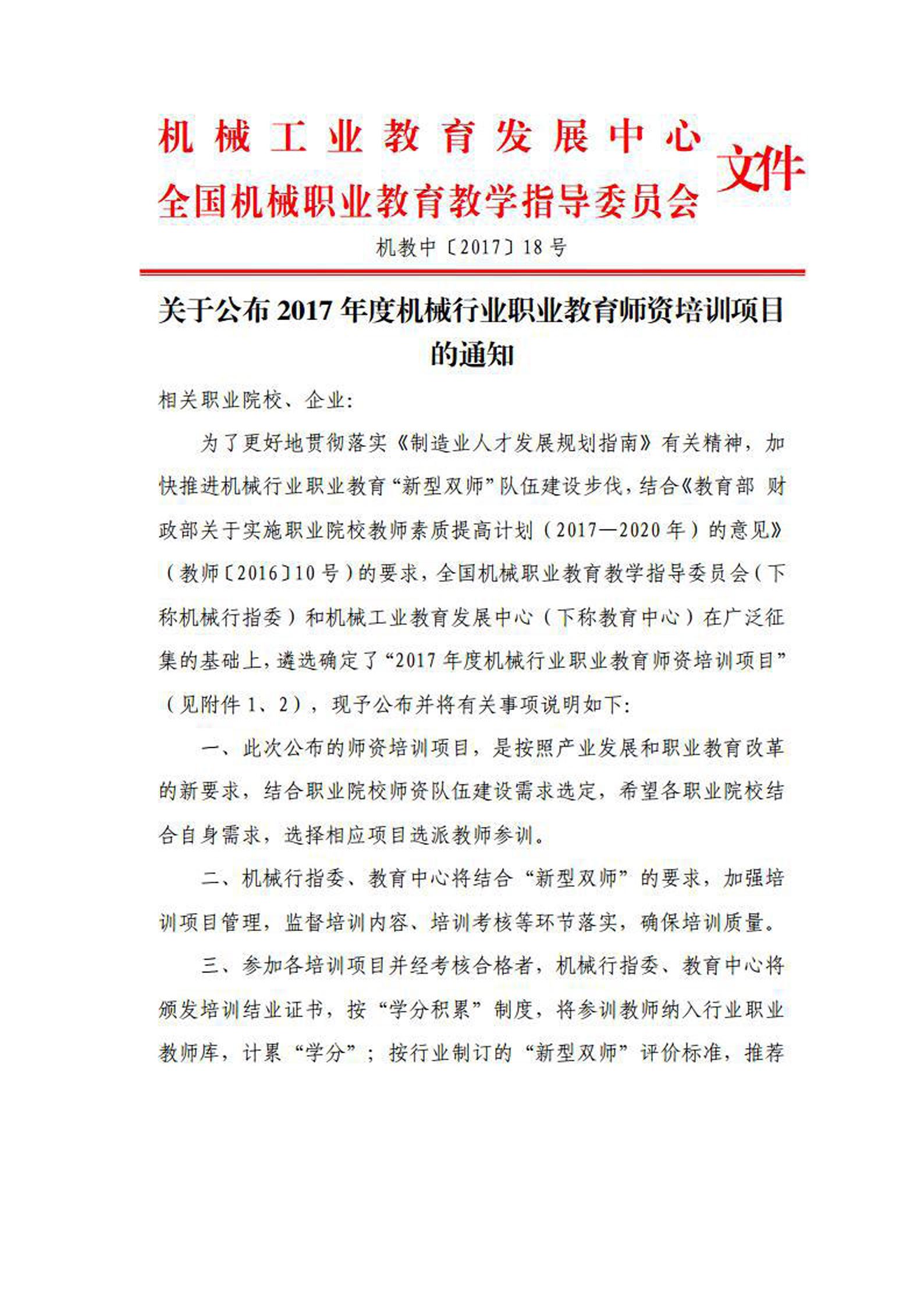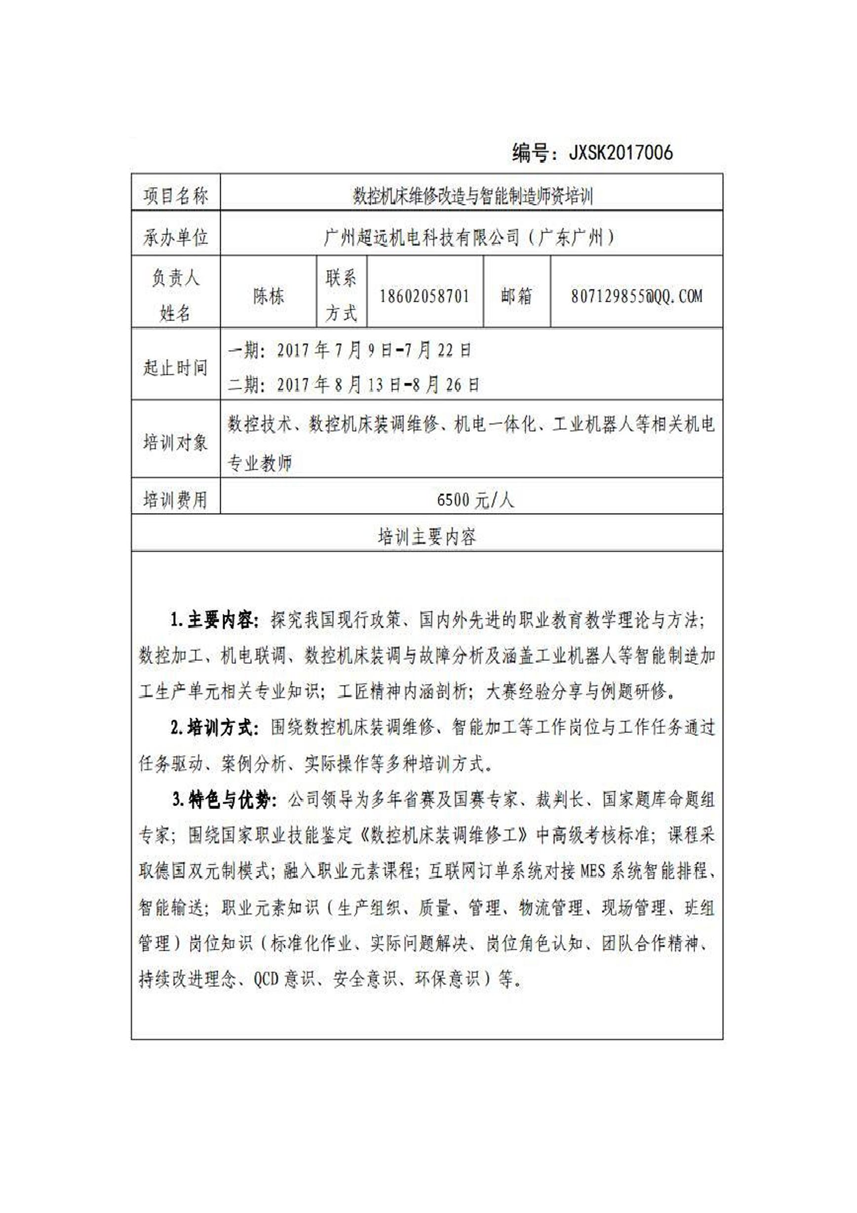 近日,機械工業教育發展中心和全國機械職業教育教學指導委員會發布了《關于公布2017年度機械行業職業教育師資培訓項目的通知》(見機教中﹝2017﹞18號),其中由廣州超遠機電科技有限公司申報的“數控機床維修改造與智能制造師資培訓”研修班,被列為推薦項目之一,編號為JXSK2017006。現按工作要求,將相關事項補充通知如下: