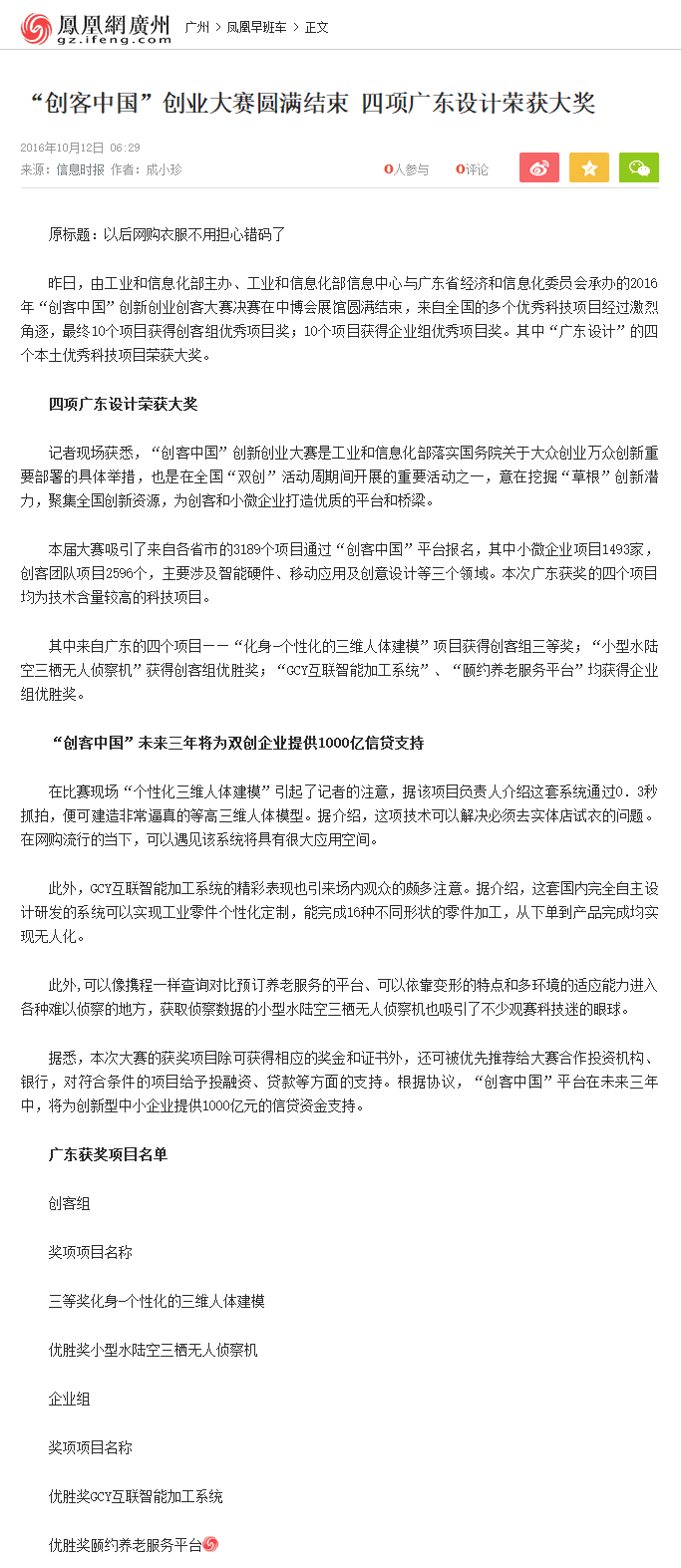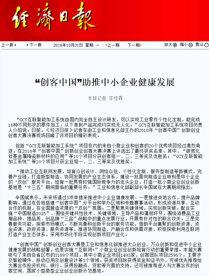 2016年10月,由國家工信部舉辦的“創(chuàng)客中國”大賽中,“GCY互聯(lián)智能加工系統(tǒng)”在全國三千多個項目中獲得前八名,在智能制造領(lǐng)域獲得第一,該賽事被“經(jīng)濟日報”、“廣州日報”、“新華網(wǎng)”、“鳳凰網(wǎng)”等全國眾多媒體報道。
