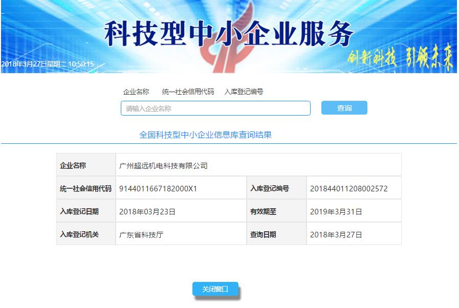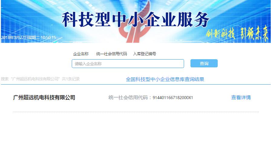 近日,國家科技部公示了2018年全國科技型中小企業信息庫入庫企業名單,廣州超遠機電科技有限公司成功入選。