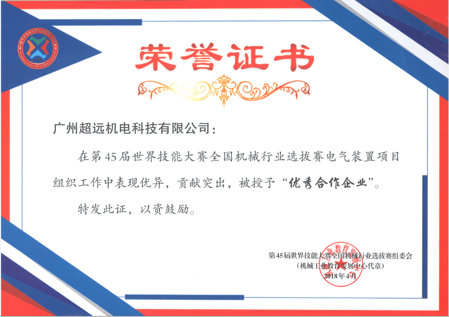 2018年4月10日-14日,機械工業教育發展中心在廣州市高級技工學校舉辦“第45屆世界技能大賽全國機械行業CAD機械設計、電氣裝置及原型制作項目選拔賽”,我司在電氣裝置項目組織工作中表現優異,貢獻突出,被授予“優秀合作企業”。