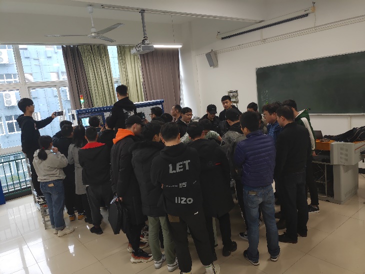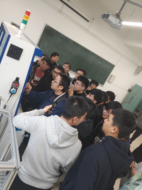 圖:超遠(yuǎn)工程師為師生們講解電氣及十字滑臺調(diào)試