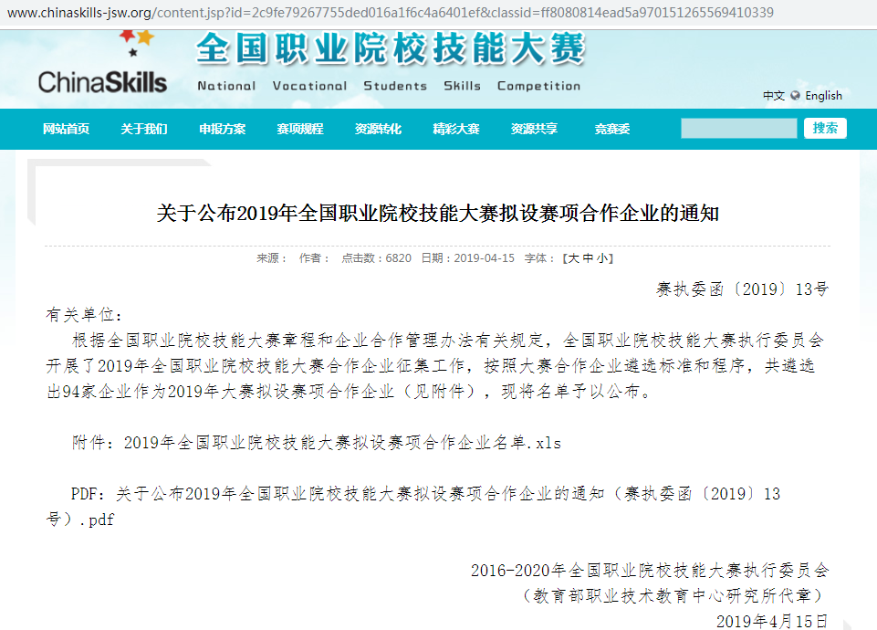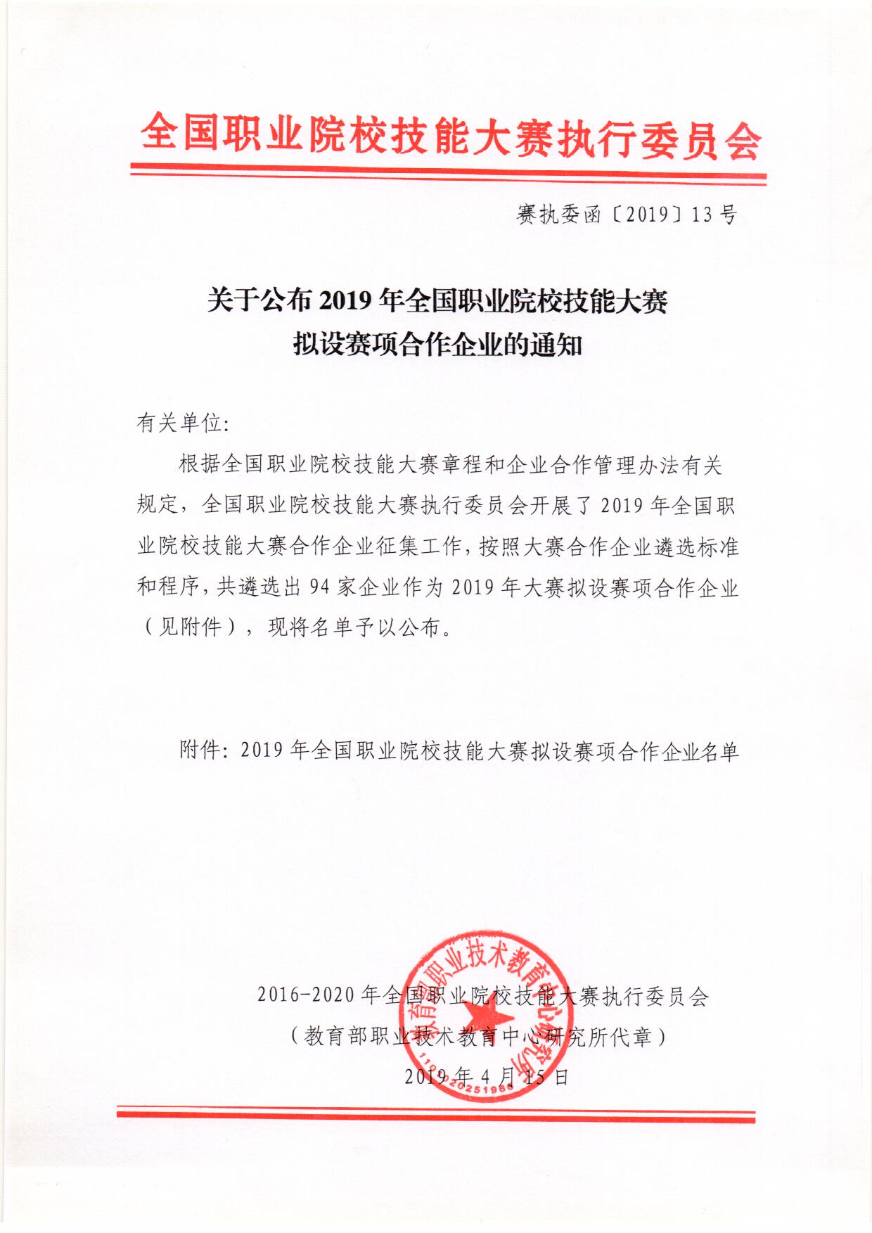 4月15日,全國(guó)職業(yè)院校技能大賽官網(wǎng)公布了“關(guān)于公布2019年全國(guó)職業(yè)院校技能大賽擬設(shè)賽項(xiàng)合作企業(yè)的通知”,
