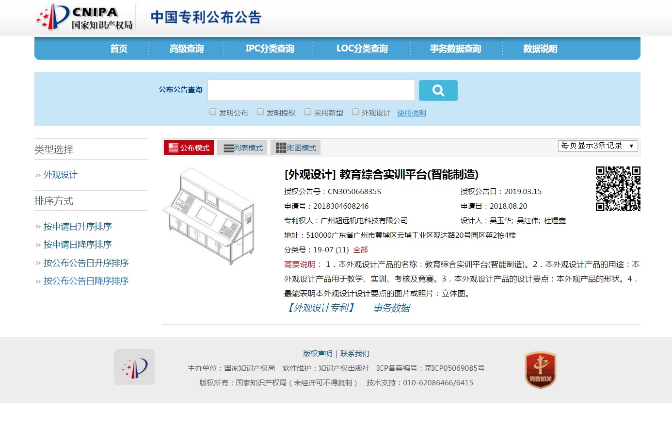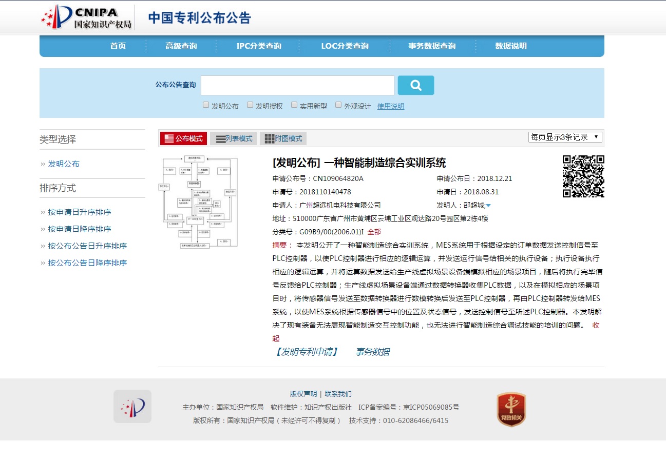 我司自主研發的GCY86-6智能制造綜合實訓平臺,已于2018年8月1日成功向國家知識產權局申請發明專利、實用新型專利及外觀專利。其中外觀專利已于2019年3月15日獲得專利授權,發明專利于2018年12月21日獲得國家知識產權局的發明公布公告。